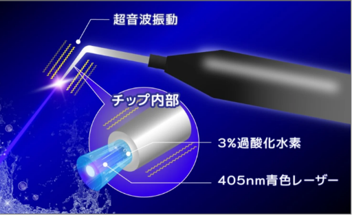 この装置は、過酸化水素水と青色LEDライトを組み合わせることで「フリーラジカル(活性酸素)」を発生させ、歯周病の原因となる細菌を効果的に殺菌します。さらに、超音波の振動によって歯石やプラークを物理的に除去することで、より高い治療効果が得られます。