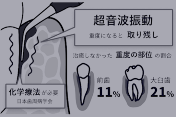 従来の超音波振動による治療だけでは、歯周病が重度に進行した場合、歯周ポケットの奥に歯石が残りやすく、十分な改善が難しくなることがあります。
